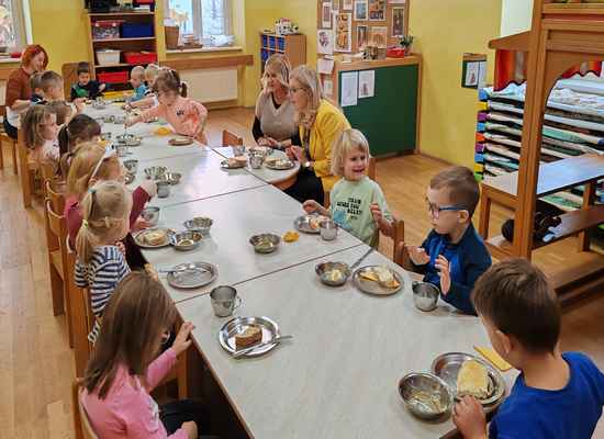 Medeni dan smo pričeli z zajtrkom, na katerega smo, v oddelek 4-5 let starih otrok, povabili županjo, go. Juhart, ravnateljico, go. Pikl in vodjo vrtca go. Brglez.