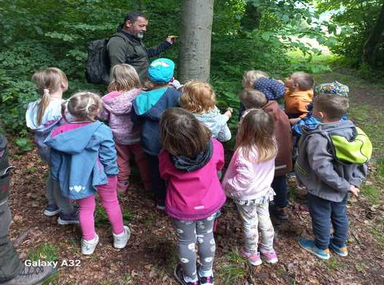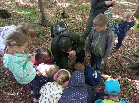 Ko smo prispeli v gozd smo bili zelo ustvarjali, na debla smo, skupaj z gozdarji, risali obraze, pri čemer smo opazovali tudi različne izbokline in črte na drevesih. Prelevili smo se tudi v ptice, ter hodili po gozdu in opazovali krošnje dreves s pomočjo ogledal. To je bila še ena bogata izkušnja, ki nam je omogočila doživeti gozd v drugačni perspektivi. Med raziskovanjem smo naleteli tudi na kup zemlje, ki smo ga z otroško domišljijo spremenili v skakalnico. Otroci so preskakovali palico in premagovali gibalne izzive. Nabirali smo tudi naravne materiale, kot so kamenje, želode, vejice, žir, liste in nato iz njih ustvarjali obraze.
