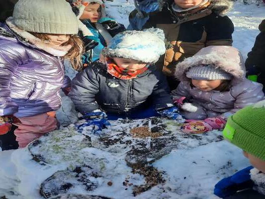 Nazaj v vrtec smo se vrnili po poti mimo kampa Vransko in se čudili, kako lep razgled je tam. Za zaključek pa smo se pozabavali s kopanjem zakladov v snegu. Hvala gozdarjem za pomoč pri pridobivanju čudovitih življenjskih izkušenj v zasneženem gozdu!