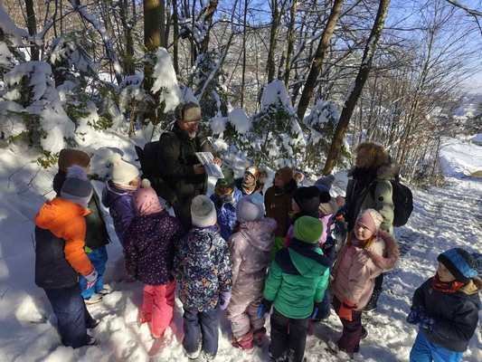 Ko smo priseli na obronke gozda na Marelici, nam je gozdar Janez pomagal pobrskati po spominu, katere živali prebivajo v našem slovenskem gozdu. Domišljija nekaterih škratov je bila zelo velika, zato smo ugotavljali ali v našem gozdu živijo tiger, opica ali srna, lisica, medved. Da je naša ugotovitev prava, smo preverili v knjigi, kjer so sledi gozdnih živali, ki smo jih naši v snegu. Pot smo nadaljevali v gozd bogat z jelkami in smrekami. Ko smo videli, koliko snega držijo jelke na vejah, smo najprej očistili majhne, kar ni bilo težko. Pri velikih sta nam pomagala gozdarja, kar pa je povzročilo veliko smeha in zabave, saj je sneg z dreves počasi padal na naše glave, kapuce, ramena in še kam. S sabo smo prinesli topel čaj, da nas ni zeblo.