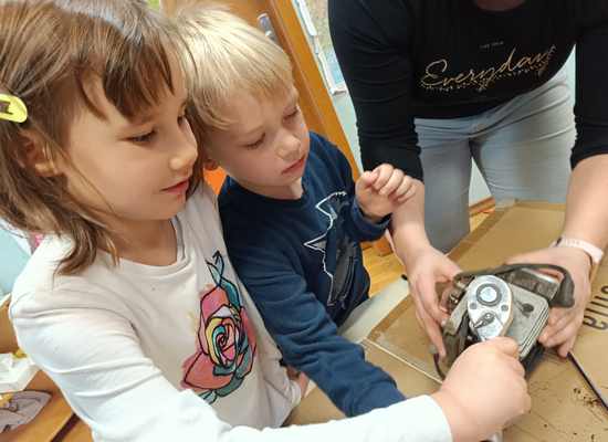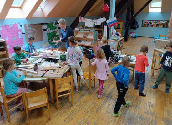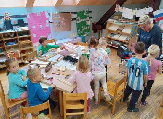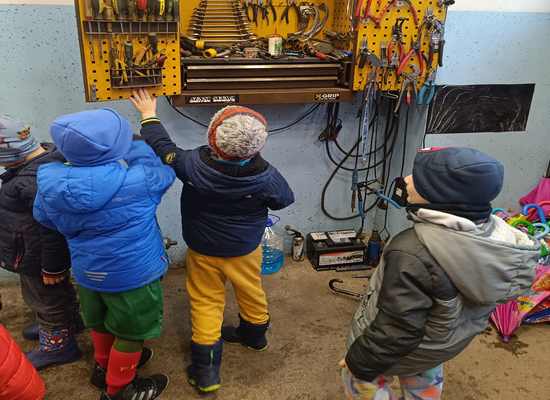 Delček tistega, kar smo v delavnicah videli in spoznali, smo kasneje preizkusili tudi v vrtcu. Otroci so se naučili rokovati z različnim orodjem in pripomočki (izvijači, klešče, primež, žaga, pila, vrtalnik) ter pri tem postajali vse bolj spretni, razvijali ročne spretnosti.