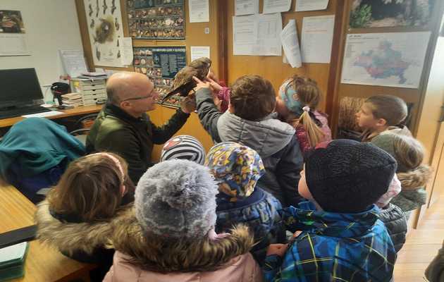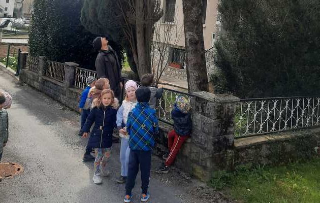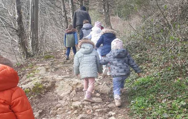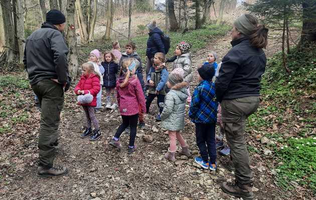 Dan je bil dokaj mrzel in vetroven, zato smo šli tokrat na sončen del gozda, na Briše. Ker pot iz vrtca na Briše vodi mimo pisarne naših gozdarjev, smo ju šli vsi skupaj iskat. V pisarni so radovedne otroške oči videle veliko zanimivega, zato se nismo mogli takoj odpraviti naprej. Gozdar Jože je moral vse živali, ki so bile na steni, pokazati bližje, da so jih otroci lahko potipali in ugotavljali, katere sploh so in ali so prave. Kanja, orel in vrana so burile domišljijo otrokom še del poti v gozd. Med hojo po gozdu so otroci pokazali, da imajo veliko znanja o pomladnih cvetlicah, gozdnih plodovih in drevesih. Gozdar je otrokom pokazal nekaj rastlin, ki so užitne tudi v pomladnem gozdu. Žvečili smo divji regrat, ki ima vonj po kuhanem krompirju, deteljico, trobentice. Ugotovili smo, da je jesen veliko bolj bogata s hrano v gozdu. Otroci so se spomnili na kostanj, gozdne jagode, gobe,…