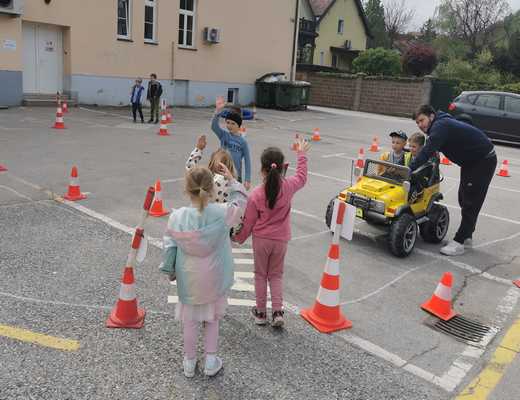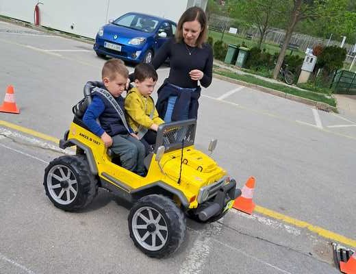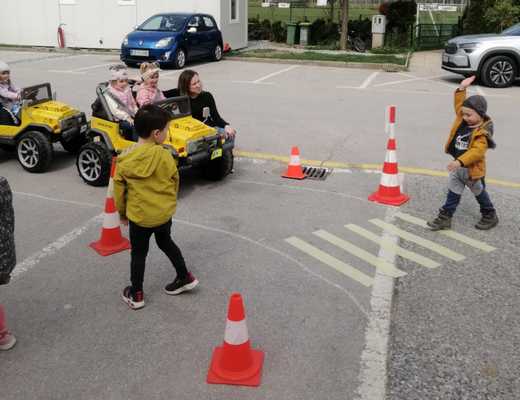 Nato pa so nas obiskali še iz AMZS Centra varne vožnje ter poskrbeli, da se je parkirišče za vrtcem spremenilo v pravi prometni poligon. Strokovna delavca AMZS Centra varne vožnje, ga. Edita Kapus in g. Simon Zajec, sta poskrbela za praktične delavnice, kjer smo utrjevali varno hojo čez prehod za pešce, spoznavali prometne znake in se lotili pobarvank semaforjev. Najbolj zanimiva delavnica pa je bila zagotovo vožnja z manjšimi električnimi avtomobili, kjer so otroci neizmerno uživali. Seveda so ob tem utrjevali tudi pravilno pripenjanje z varnostnim pasom in vedenje med vožnjo v vozilu. Svoje motorične spretnosti so lahko preizkusili kot vozniki in tudi kot sovozniki. AMZS Centru varne vožnje smo zelo hvaležni, da so si vzeli čas in nam omogočili tovrstno izkušnjo.