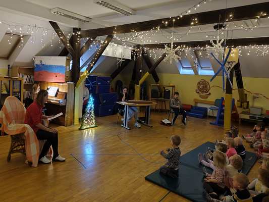 Začeli smo ustvarjalno: izdelovali smo okraske in z njimi okrasili igralnice, hodnike, večnamenski prostor in novoletno smrečico. Tako smo ustvarili praznično vzdušje. Za piko na i pa smo v petek prisluhnili glasbeni pravljici Čarobni gozd v veselem decembru, med katero smo doživeli čarobni prižig lučk v večnamenskem prostoru. V goste smo povabili osnovnošolske otroke, ki obiskujejo glasbeno šolo. Obogatili so glasbeno pravljico z živo glasbo. Prisluhnili smo citram (Lara Kropec), klarinetu (Kristjan Brezovnik) in klavirju (Alja Kotnik). Le tem se zahvaljujemo za njihov nastop.