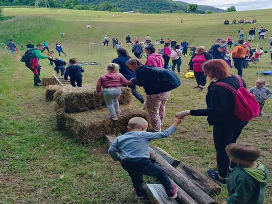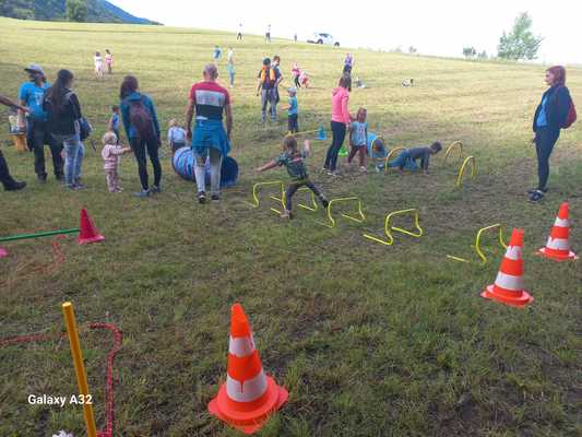 Za začetek smo se zbrali pri plezalni steni na Vranskem in se od tam dalje po dveh poteh – polžkovi in gamsovi – odpravili na kratek orientacijski pohod, ki nas je pripeljal do cilja na travniku na Brišah. Družina Lesjak nam je z veseljem posodila travnik za naše druženje, za kar smo jim izredno hvaležni. Na travniku so nas že pričakale številne aktivnosti. Preizkusili smo se v mini teku – starš + otrok štuporamo, v malem nogometu, vlečenju vrvi, plezanju po poligonu iz slame in lestev, igranju na improvizirane instrumente – kamne, zadevali smo luknje pri igri Štrbunk in odbijali pisane balone. Udeležba na srečanju je bila precejšna, večina staršev je s svojimi otroki sodelovala pri vseh aktivnostih in bila tako otrokom zgled in podpora pri gibanju na svežem zraku. Takšna srečanja nudijo obilo možnosti za navezovanje stikov med starši ter krepijo povezanost med starši in otroki.