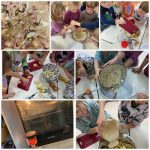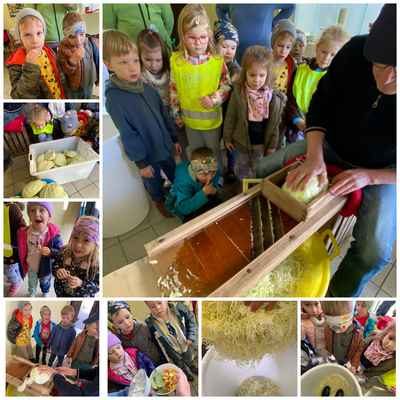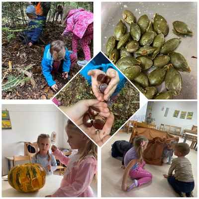 Jesen je tisti mesec, ki se ga mnogi najbolj veselijo, saj se poleg barvitih listnih ploskev narava poigra še z barvitimi plodovi. Užitni ali le kot okras, ni važno. Je namreč zelo bogata z darovi. Na njivi pobiramo krompir, buče, v vinogradu trgamo grozdje, v sadovnjaku nabiramo hruške, jabolka, v gozdu nabiramo kostanj. Zato smo se v oddelku 4–6 zavihali rokave in se lotili različnih dejavnosti. Ob prebiranju ter dramatizaciji zgodbe Razbita buča smo spoznavali bučo. Pripravili smo bučno juho ter spekli bučnice. Luščili smo koruzo in fižol. V gozdu nas je presenetila obilica debelega kostanja za piknik na igrišču. Kaj pa zelje? Tista zelena zelenjava. Da bi preverili kakšno je smo se odpravili na pohod do Kaple. Tam sta nam Ivica in Slavko prikazala tradicionalno ročno ribanje zelja, tlačenje ter kisanje. In veste kaj smo ugotovili? Da je zelje zelo okusno. Za sladek zaključek jeseni pa smo si v tednu slovenske hrane pripravili še zdrav jabolčni narastek.