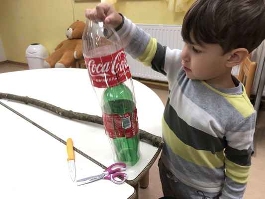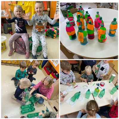 Oddelek 4-5 let vam pošilja sporočilo, da se iz plastenk naredijo super stoli, primerni tudi za zunaj. Ne pozabite in ponovno uporabite.