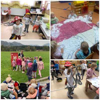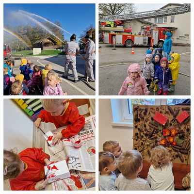 Pester program na temo požarne varnosti je potekal po oddelkih. Otroci so tako spoznali gasilsko opremo in gasilsko zaščitno obleko, katero so lahko tudi preizkusili. Z ustvarjalnimi delavnicami so poustvarjali gasilska vozila ter izdelovali gasilske čelade, se igrali ustvarjalno igro z gasilsko opremo, poslušali gasilko himno, se naučili na katero številko moramo poklicati gasilce, preko igre spoznavali katere informacije moramo povedati, ko pokličemo na 112. Z gibalnim poligonom čez celoten vrtec pa smo prikazali, kako se morajo spretni gasilci gibati v primeru požara, med potresom in pri poplavah.