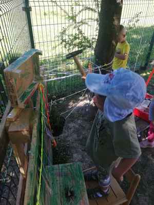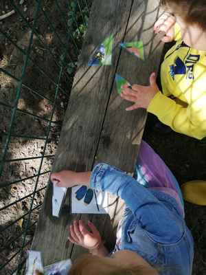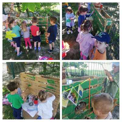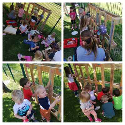 Leseni paleti smo obesili na ograjo, jih pobarvali in opremili. Nastala sta dva kotička: glasbeni – iz neuporabnih kuhinjskih posod in pripomočkov, kjer spontano preizkušamo zvočnost, ritem in glasnost. In raziskovalni kotiček – opremljen z živimi bitji – črički, hrošči, polži, deževniki in slikovnim, didaktičnim materialom ter pripomočki. Spoznavamo nove stvari, opazujemo, odpiramo pot domišljiji in nezavedno širimo glasbene ter naravoslovne kompetence.