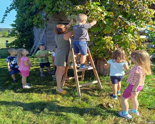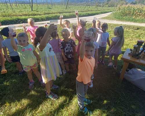 Ker je bil kozolec deloma obraščen z vinsko trto, ki je bogato obrodila, smo tam z otroki priredili pravo trgatev. Povabili smo oddelek 4-6 in skupaj grozdje najprej potrgali, pri čemer smo si pomagali tudi z lestvijo, kar je bilo otrokom še posebej zanimivo. Nato smo grozdje pecljali, ga stisnili v preši in komaj čakali, da poizkusimo sladek sok, ki je pritekel iz preše.