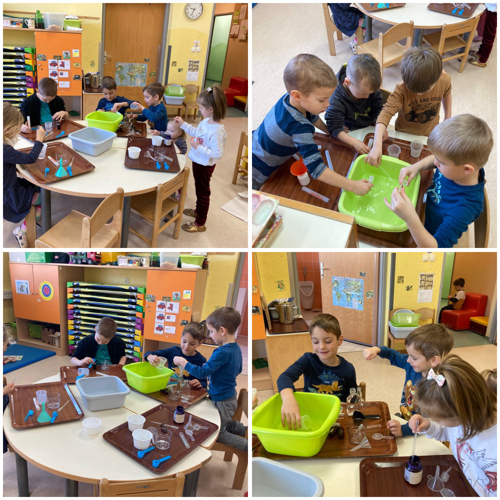 Spoznali smo volumen – polnili posode s tekočino, prelivali, pretakali, primerjali prostornino različnih posod različnih oblik, rokovali z lijaki, epruvetami. Raziskovali smo tudi simetrijo – risali, dodajali, preslikovali in se igrali ritmično tapkanje pest-dlan. Prirejali smo števila, šteli, po zgodbi smo razvrščali slike in pripovedovali ter si izmišljali svojo zgodbo.
