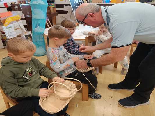 V oddelku 5–6 sta nas obiskala dedka dveh dečkov iz oddelka in nam predstavila svoj poklic. Gospod Franci Pajnkihar nam je predstavil poklic pletilca košar, gospod Franci Turnšek pa poklic krojača. Za čas in vložen trud se obema iskreno zahvaljujemo.