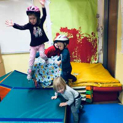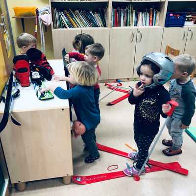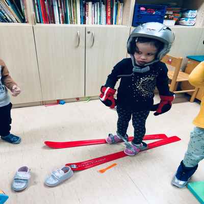 Seveda smo vsako olimpijsko disciplino tudi preizkusili, kajti kljub temu, da smo majhni, smo pravi športniki. Z visoke blazine smo skakali v globino pol metra in se prelevili v smučarske skakalce. Nataknili smo si smučke in prehiteli vsakega, ki je prišel mimo. Pa čeprav kar na podlogi v igralnici. Posebej nas je navdušil hokej, za katerega sploh nismo vedeli, da ga znamo igrati. Seznanili smo se tudi z varnostjo pri zimskih športih, ves čas smo nosili čelade in nasploh pazili eden na drugega.
