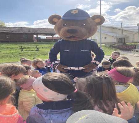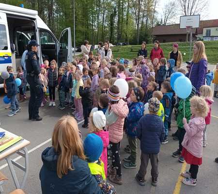 Z namenom uresničevanja tega cilja in premagovanja strahu pred policisti, smo medse povabili policiste. Našemu povabilu se je odzval policist Leon, ki je maskota policije. S sabo je pripeljal tudi policiste Policijske postaje Žalec ter predstavnika Policijske postaje vodnikov službenih psov Celje.