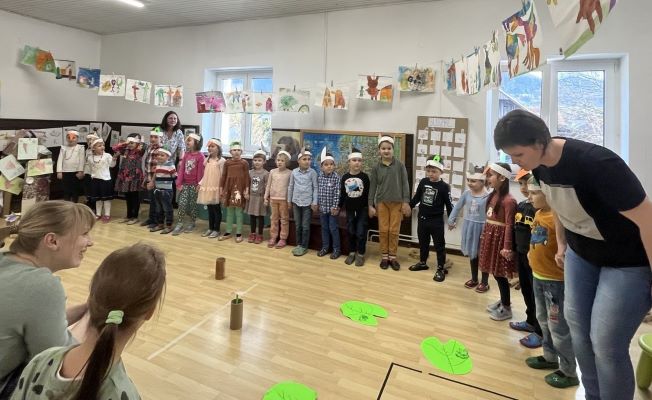 Srečanje je bilo tudi v gozdu z nalogami, kot so iskanje vrvice, ustvarjalna igra z vrvico in povezovanje vseh vrvic v krog, kar je prav tako prispevalo k razvoju otrokove domišljije ter telesne spretnosti v naravnem okolju, ki je bilo zaključeno s poligonov v igralnici.