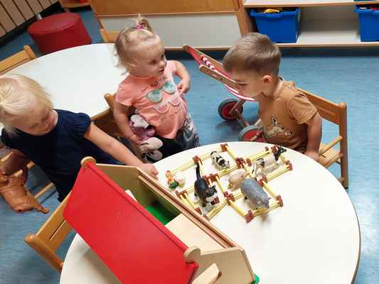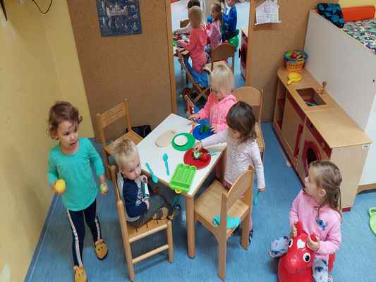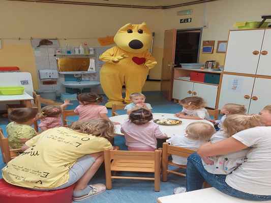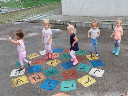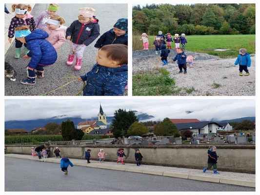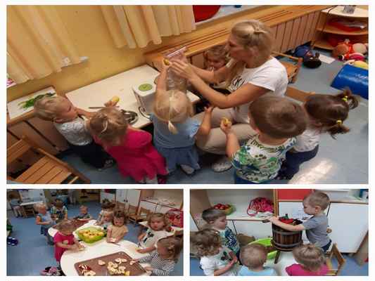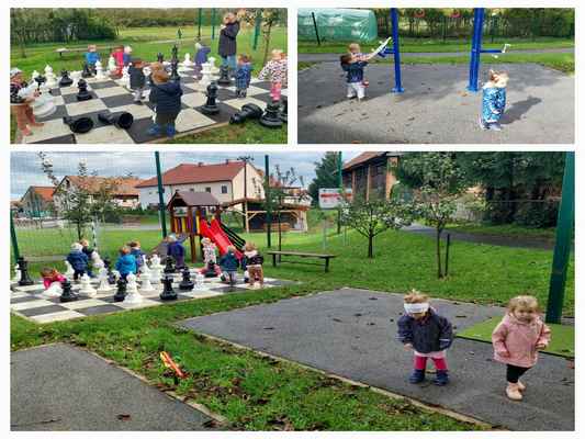 Uvajalni mesec je minil brez večjih pretresov. Čeprav združeni iz treh različnih skupin so se otroci oddelka 2-3 krasno navadili na dnevno rutino, enako tudi novinka. Družno smo raziskovali bližnjo okolico – igralnico, kotičke, igrišče, igrala in telovadnico, kot tudi daljno vse do igrišča Razgan v Ojstriški vasi. Spoznavali smo prva jesenska opravila in se preizkusili v prešanju jabolk, grozdja in trebljenju buč. Na raziskovalnem potepu smo iskali zajčka, a smo namesto njega srečali vse drugo (krave, telička, polže…). Obiskal nas je kuža Pazi, maskota zavarovalnice Triglav, ki je ene nasmejal, druge pa spravil v jok. Ogledali smo igrici v izvedbi strokovnih delavk Razbita buča in Jabolko. In ker imamo vsi radi živali, smo si po pravljici Pod medvedovim dežnikom izdelali dekoracijo za našo igralnico.