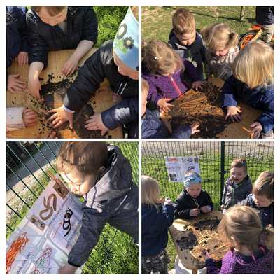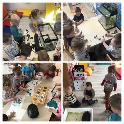 Z bogatim likovnim ustvarjanjem – modeliranjem z glino, slikanjem, risanjem z zemljo ter ustvarjanjem ob opazovanju živali in rastlin, smo povezali naravoslovje z umetnostjo. Otroci so se srečali tudi z deklamacijo o deževniku, pesmijo o žabah, kukavici in o gosenici. Redno smo obiskovali gozd, naravo in prisluhnili pticam ter jih poskušali prepoznati po oglašanju. Obeležili smo mednarodni dan biotske pestrosti z izdelavo plakata in obogatili naše spodbudno učno okolje.