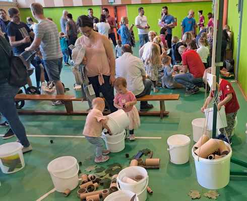 V četrtek 8.6. smo za zaključek šolskega leta 2022/23 v vrtcu Tabor pripravili srečanje za starše. Otroci in njihovi starši so nas obiskali v telovadnici, kjer smo pripravili dejavnosti, ki so se navezovale na naš kurikulum. Najpomembnejše pa je bilo to, da so bile vse dejavnosti oblikovane na trajnostni razvoj. Tako so iz odpadnega materiala izdelovali bobne in ropotulje, lutke in se z njimi preizkusili v gledališču, razvrščali odpadke, tehtali raznovrstni naravni material, se igrali igro spomin, z lutko Gingo izvajali govorno jezikovne vaje in tekmovali med sabo z žogami iz papirja. Namen trajnostnega razvoja je bil, da tako otroci kot starši spoznajo, kako izkoristiti odpadni material, ki ga imamo doma na pretek in da ni potrebe po novih igračah.