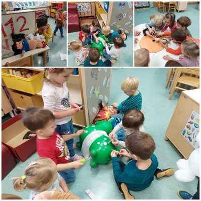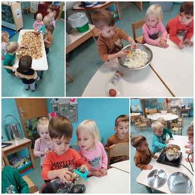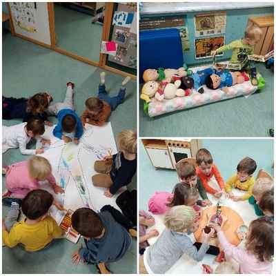 V mesecu novembru smo v oddelku 3-4 spoznavali sebe in svoje telo. Ob najrazličnejših slikovnih pripomočkih, knjigah, sestavljankah in človeškem torzu smo spoznavali delovanje naših organov, zgradbo telesa, funkcijo čutil… Skozi simbolno igro, kjer so otroci sproščali svojo domišljijo in svoj pogled na dogajanje, smo spoznavali delo zdravnika in medicinske sestre, povijali rane, poslušali bitje srca, merili temperaturo, dajali injekcije, hranili in previjali dojenčke… Ob maketi pljuč in pihanju milnice smo spoznavali funkcijo pljuč. Navajali smo se na temeljito umivanje rok in se navezali na koronavirus. Preizkusili smo se v okušanju, vonjanju in tipanju različne hrane in predmetov. Otroci so bosih nog hodili po čutni poti. V okviru evropskega tedna zmanjševanja odpadkov smo se učili razvrščanja brisačk in papirnatih robčkov v koš za biološke odpadke, s čimer smo seznanili širšo javnost. Poleg vsega tega nam je Friderik dal nalogo, da kompostnik obogatimo z gnojem, ki smo ga dobili na kmetiji Lukman. Enega izmed dni smo si obogatili z dramatizacijo Trije prašički, kjer smo ustvarjali z lesom, palicami, glino, vejami in storži. Otroci so igrali različne vloge in sproščali svojo domišljijo in kreativnost.