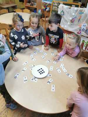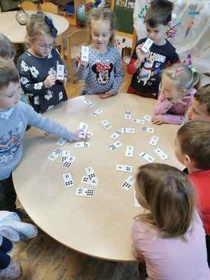 - Hitre slike – otrokom za nekaj sekund pokažemo kartico in otroci prepoznajo število pik na kartici. Število pik, smo nato povezali z različnimi gibalnimi nalogami npr. toliko kot je pik, toliko naredimo poskokov. V naloge čim bolj vključimo otroke npr., da povedo gibalno nalogo, da kažejo kartice…